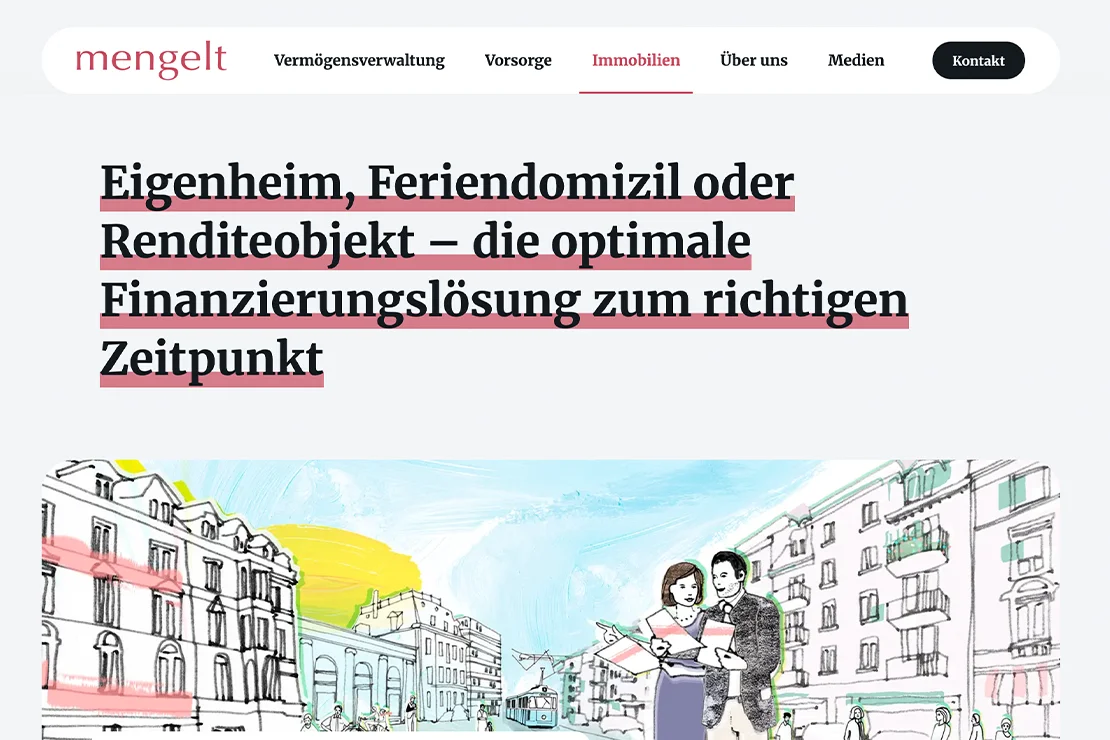 Das Angebot präsentiert sich klar strukturiert. Die exklusiv für Mengelt Vermögensverwaltung gezeichneten Illustrationen von Anja Denz wurden bewusst als eigenständige Bildwelt eingesetzt. Die Serifentypografie sorgt für Seriosität, die Hierarchie für Ruhe und Übersicht.