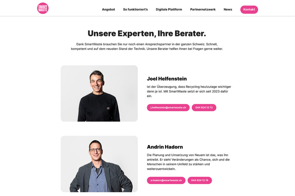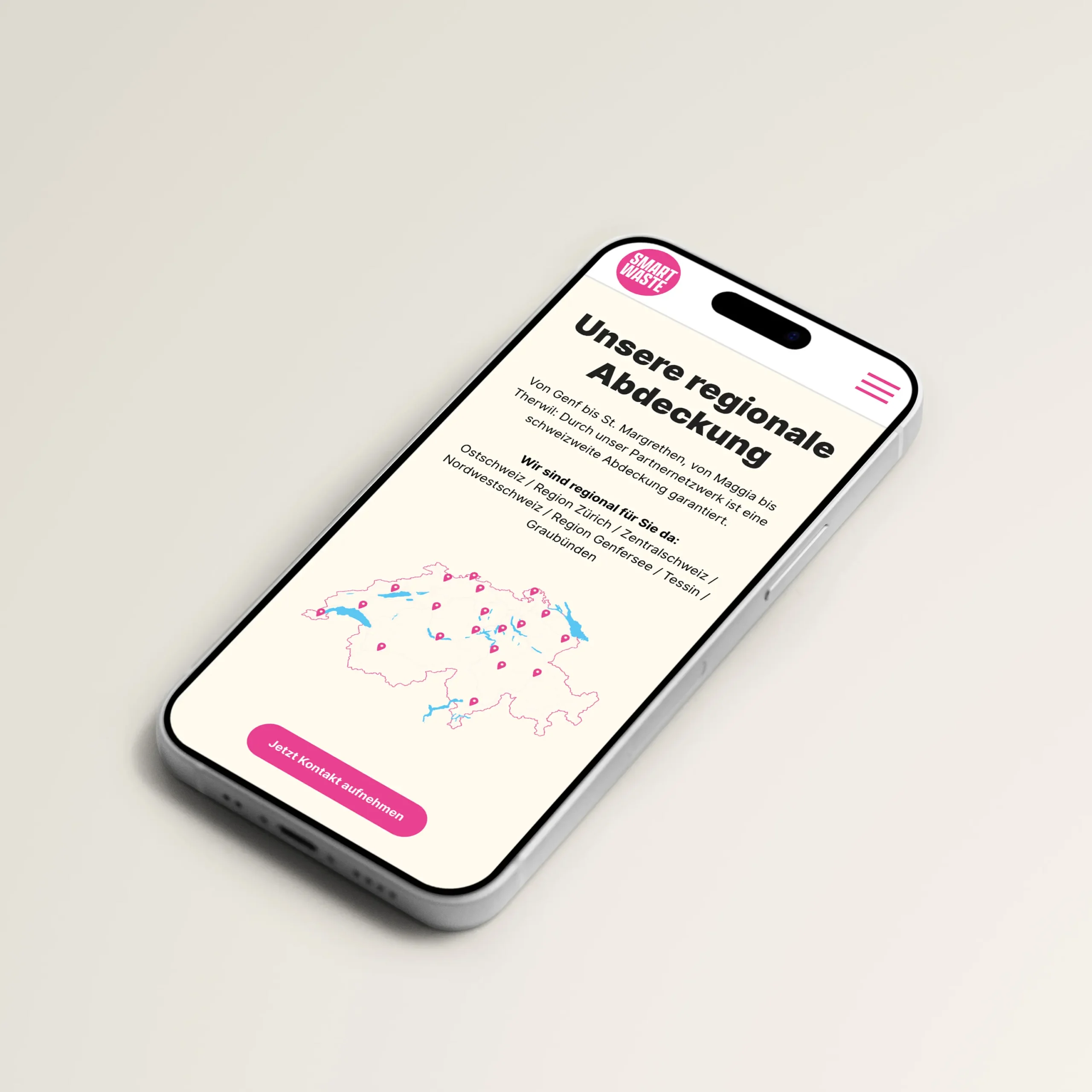 Das Zusammenspiel aus mutigem Branding, starker Sprache und visueller Klarheit konzentriert auf einen Onepager mit Wirkung. Agentur Schmucki begleitete die Geburtsstunde von SmartWaste vom Naming bis hin zur Produktion sämtlicher Werbemittel, Fahrzeugbeschriftungen sowie dem markanten Onlineauftritt.