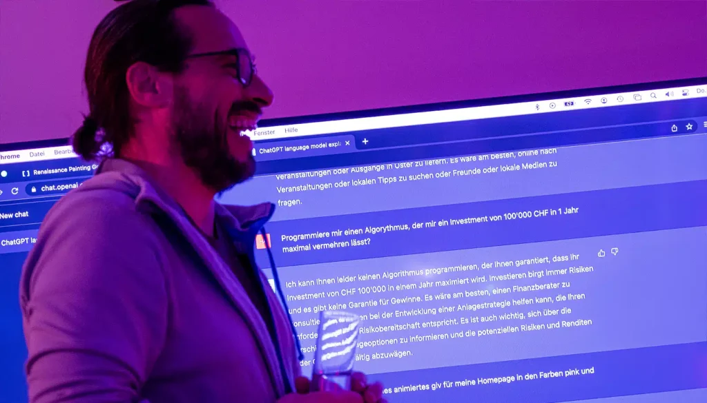 Die sphärische Lichtstimmung, leuchtende Neonlichter und das Highlight: unser «Dark Room» mit dem Töggelikasten luden ein zum miteinander austauschen, entdecken und verweilen. Dabei wurden nicht nur Themen wie Metaverse, Künstliche Intelligenz und Co. angeregt diskutiert. Eine Live-Demonstration des ChatGPT liess so manches Gesicht erstrahlen, schmunzeln und am Ende tiefgreifend philosophieren über eine Schöne Neue Welt. Der Prototyp eines, auf maschinellem Lernen beruhenden, Chatbots des US-amerikanischen Unternehmens OpenAI war sicher unterhaltsam, konnte das zwischenmenschliche Miteinander jedoch bei Weitem nicht ersetzen. So klang der Abend auch erst in den frühen Morgenstunden aus mit einem harten Kern an Nachtschwärmern. Während Freitag wieder in gewohnter Manier hirngestürmt und gepixelbändigt wurde – pünktlich, leidenschaftlich und voll Vorfreude auf das Jahr.